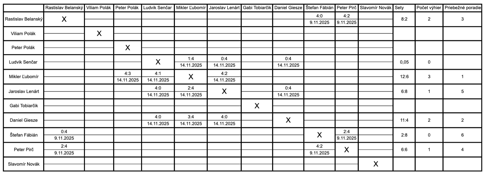 - Zápasy prebiehajú počas celého novembra, decembra 2025 a januára 2026 – hráči si termíny dohadujú individuálne.